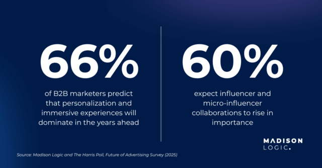 The promise of AI is clear: it enables personalization at scale in a way humans alone cannot. By analyzing vast volumes of behavioral, intent, and engagement data in real time, AI can match the right message to the right person at the right moment—something impossible to do manually across thousands of accounts and touchpoints. Two in three marketers predict that personalization and immersive experiences (66% each) will dominate advertising in the years ahead. Another three in five (60%) expect influencer and micro-influencer collaborations to rise in importance, signaling that even in B2B, peer-to-peer authenticity matters.